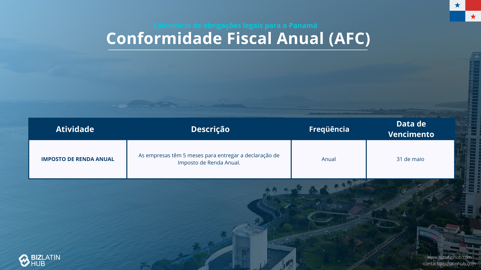 Quais são os requisitos de conformidade fiscal anual da entidade? | As empresas no Panamá têm 5 meses para apresentar sua declaração anual de imposto de renda, que deve ser feita até o prazo final de 31 de maio. |