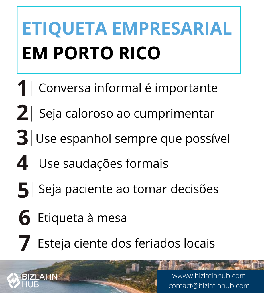 A cultura empresarial porto-riquenha combina a cordialidade latino-americana com a eficiência norte-americana. Entender a etiqueta empresarial é fundamental nesse ambiente. A pontualidade é fundamental, apesar da abordagem descontraída do “horário da ilha”. Chegue na hora certa para as reuniões, embora elas possam começar mais tarde.