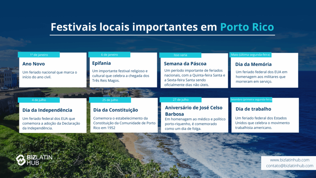 Porto Rico observa 16 feriados públicos e concede 15 dias de férias, incluindo licenças para eventos pessoais, como aniversários e comparecimento a tribunais. As empresas devem considerar esses dias em seus cronogramas.