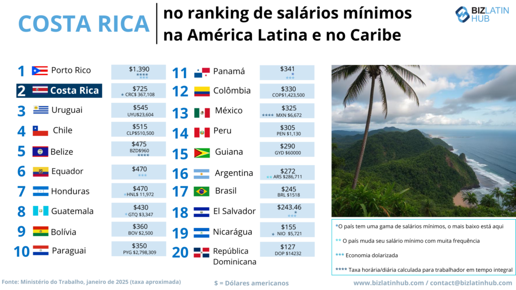 Qual é o salário mínimo na Costa Rica? | O salário mínimo atual, em janeiro de 2025, varia muito, dependendo do setor, de CRC$ 367.108 a CRC$ 784.139 (aproximadamente US$ 725 a US$ 1.550). |