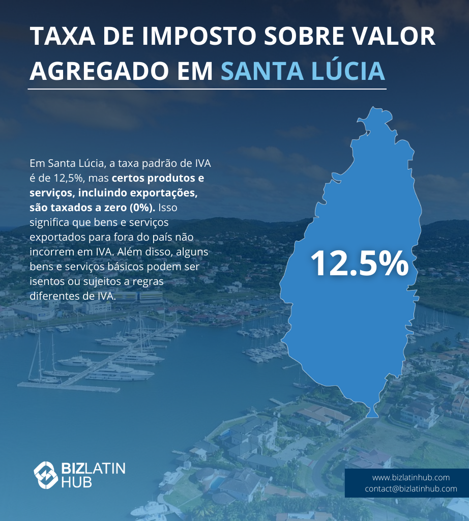 Qual é a alíquota do imposto sobre valor agregado em Saint Lucian? | A alíquota padrão do IVA é de 12,5%, e bens e serviços específicos podem atrair uma alíquota de 0%. Notavelmente, o setor hoteleiro e os serviços associados estão sujeitos a uma alíquota de 10%, enquanto uma alíquota reduzida de 7% para serviços de acomodação turística está em vigor desde 1º de dezembro de 2020. |