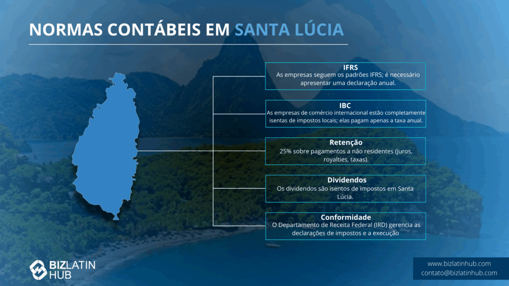 Santa Lúcia, no Caribe, apresenta perspectivas de negócios promissoras para investidores internacionais. Com uma localização estratégica e regulamentações tributárias vantajosas, você pode criar uma empresa em Santa Lúcia, formação de empresas em Santa Lúcia é um excelente centro para você abrir um negócio. No entanto, é fundamental entender as exigências fiscais e contábeis de Santa Lúcia. Neste artigo, descrevemos as principais informações contábeis e taxas de impostos para que você tenha sucesso em Santa Lúcia. Continue lendo para obter insights essenciais sobre a realização de negócios nessa nação caribenha em evolução. Este guia detalha os diferentes regimes tributários que se aplicam às empresas nacionais e às International Business Companies (IBCs) offshore.