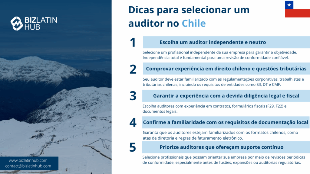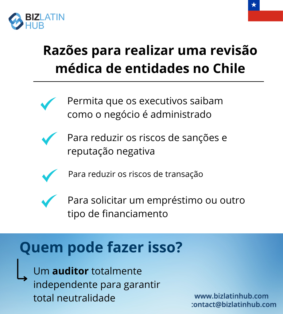 Quem realiza um exame de saúde da entidade no Chile? | Isso deve ser feito por um auditor totalmente independente para garantir total neutralidade. O auditor também deve conhecer bem a legislação societária chilena. |
