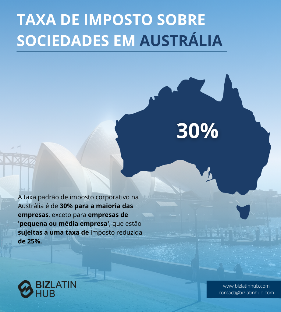 Qual é a alíquota de imposto corporativo na Austrália? | Todas as pessoas jurídicas estão sujeitas a uma alíquota de 30% sobre a renda tributável, sendo que as PMEs estão sujeitas a uma alíquota reduzida de 25%. |