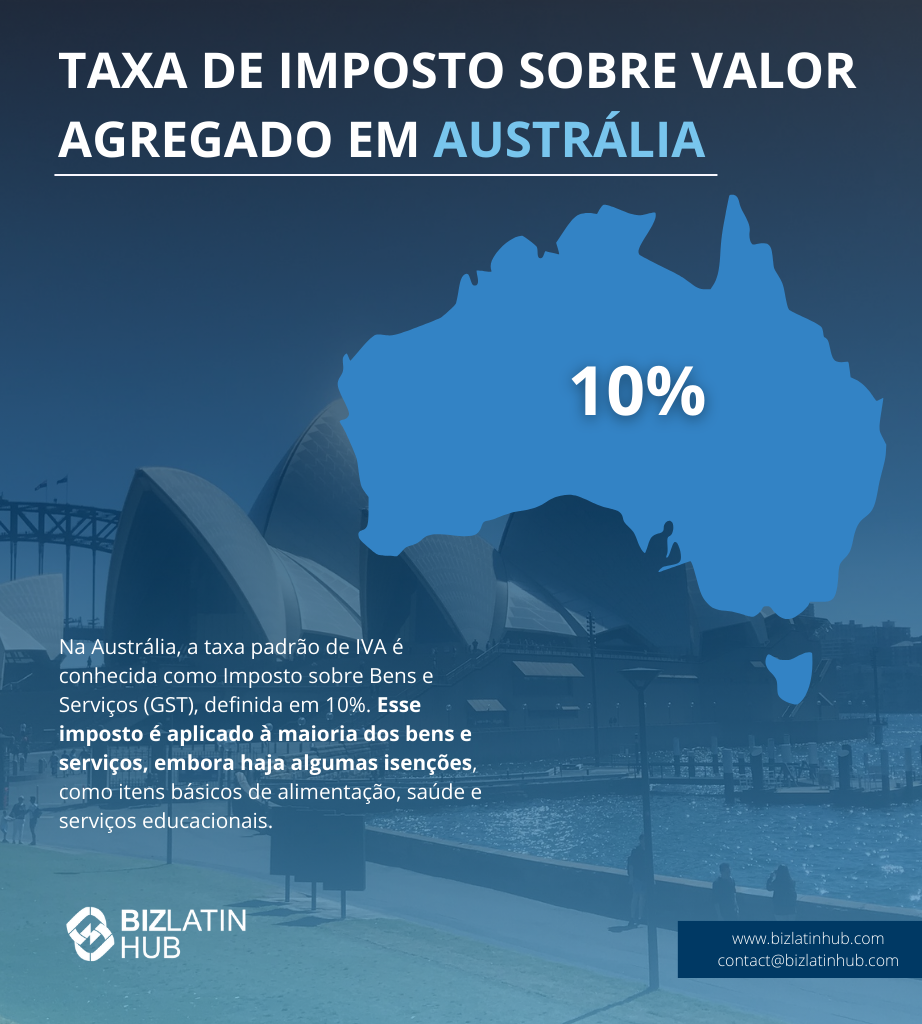 Taxa do imposto sobre valor agregado australiano | A Austrália aplica uma alíquota padrão de 10% de imposto sobre bens e serviços (GST). |