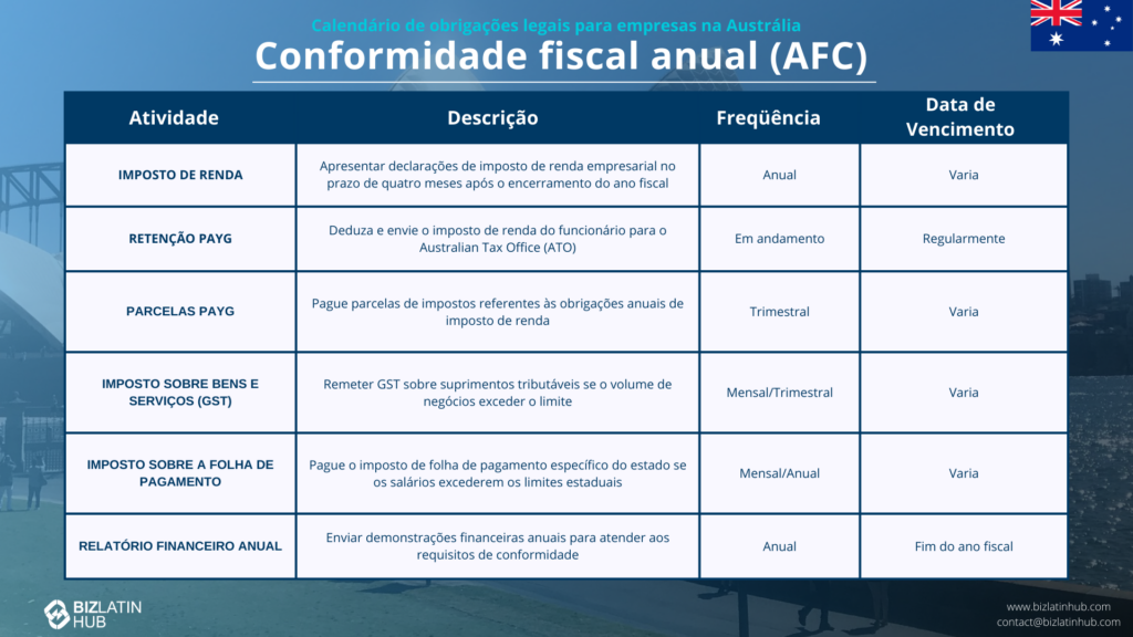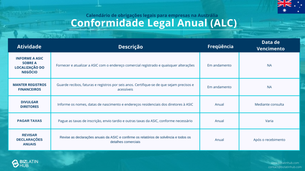 Alguns dos principais requisitos de conformidade legal para uma empresa na Austrália incluem o seguinte: