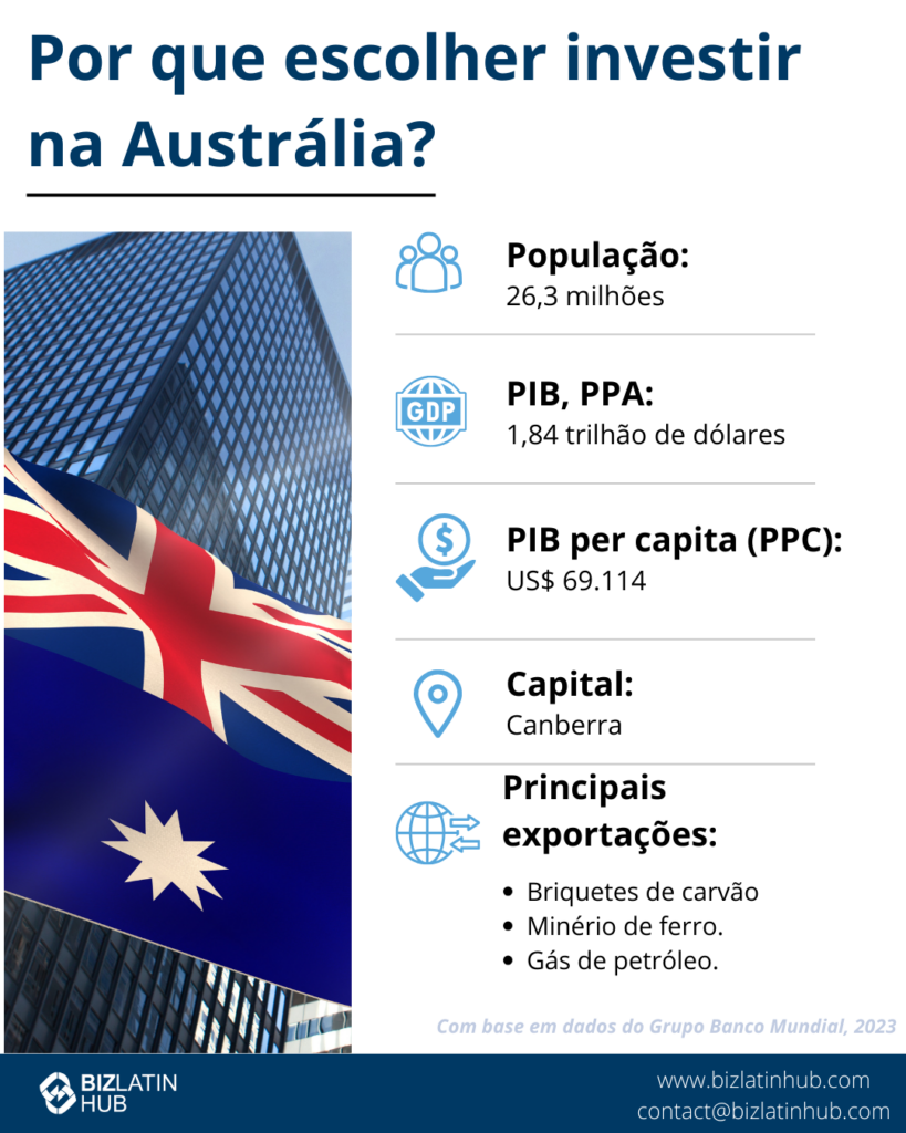 Por que você escolhe investir na Austrália? | Investir na Austrália oferece crescimento econômico consistente, uma força de trabalho altamente qualificada, localização estratégica, governança sólida e infraestrutura de classe mundial. |