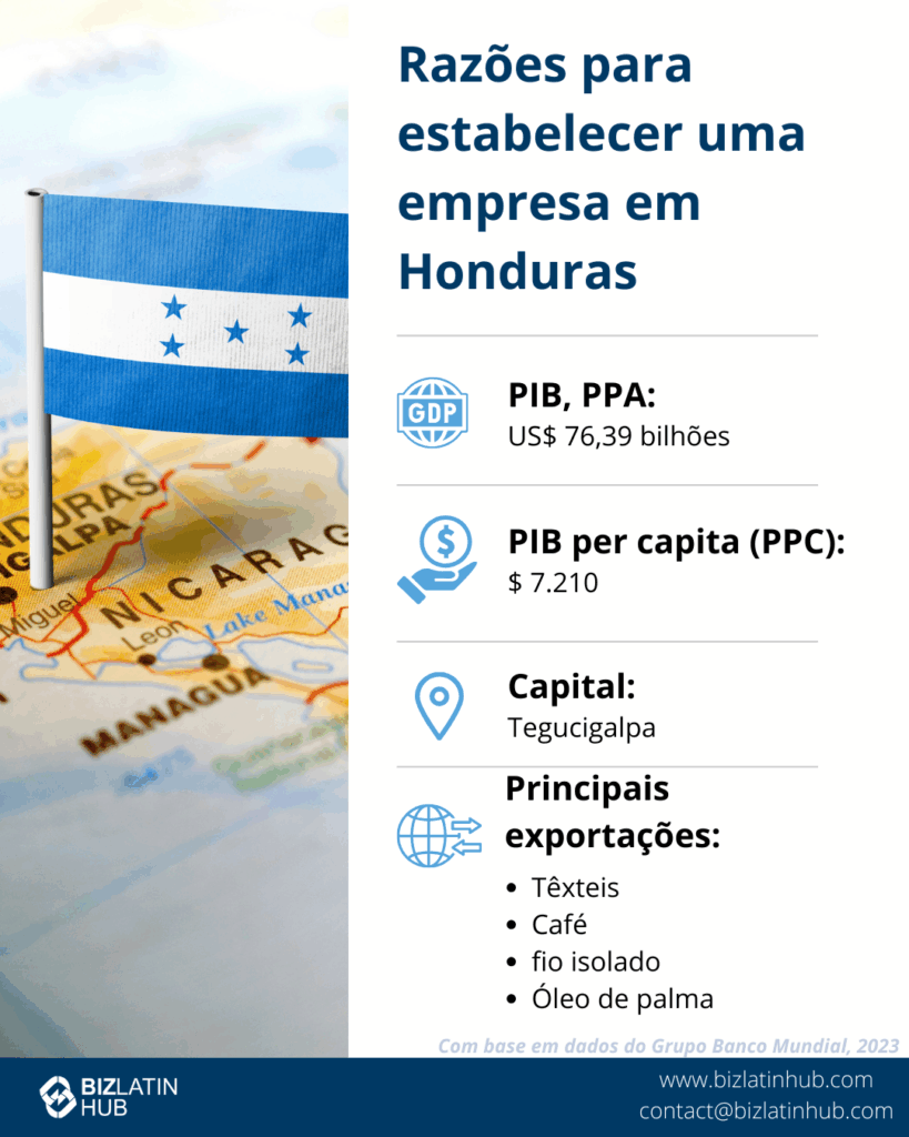 Infográfico intitulado "6 Steps to SET UP A company in Honduras" (6 etapas para abrir uma empresa em Honduras), do Biz Latin Hub. As etapas incluem: depositar capital inicial, abrir uma conta bancária corporativa em Honduras, registrar artigos de incorporação, solicitar código de identificação fiscal, registrar-se nas Câmaras de Comércio locais, solicitar certificado e licença de zoneamento e registrar-se junto às autoridades locais.