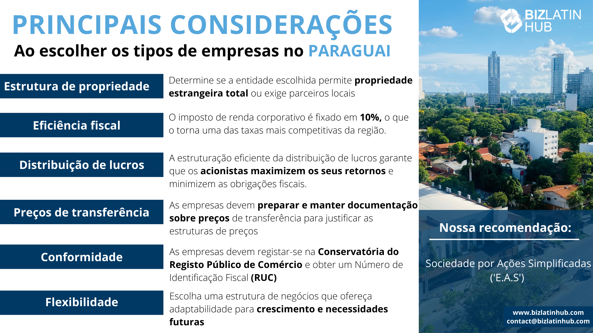 O Paraguai é um destino de negócios em crescimento na América Latina, conhecido por seus baixos impostos e regulamentações corporativas simplificadas. Os empresários estrangeiros e locais devem escolher a estrutura jurídica correta (seja uma SRL, SA ou filial estrangeira) para operar em conformidade. Este guia explica os tipos de empresa disponíveis e como você pode registrar uma empresa no Paraguai e como fazer uma incorporação bem-sucedida.