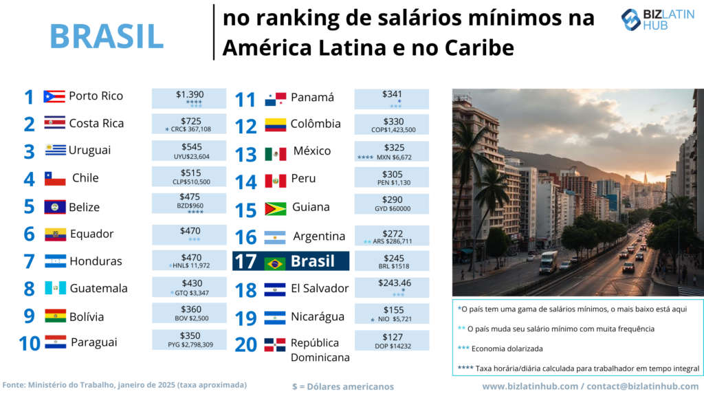 O salário mínimo no Brasil é de BRL$ 1.518 (aproximadamente USD$ 245). No entanto, essa não é necessariamente a taxa que você deve oferecer. Nos principais setores que exigem trabalhadores qualificados e especializados, você precisará oferecer pelo menos a taxa padrão do mercado. Um especialista local em contratação no Brasil será de grande valia para garantir que você não esteja pagando a mais ou oferecendo tarifas pouco atraentes que dificultem o recrutamento de talentos de qualidade.