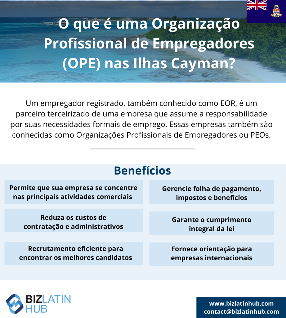 Nos últimos anos, as ilhas surgiram como um farol para investidores e empresários estrangeiros que buscam oportunidades lucrativas e um ambiente estável para o crescimento financeiro. Talvez você queira dar uma olhada na formação de empresas nas Ilhas Cayman ou saber mais sobre um PEO nas Ilhas Cayman. O uso de uma Organização Profissional de Empregadores (Professional Employer Organization), ou PEO nas Ilhas Cayman, ajuda a simplificar as complexidades da expansão global. Ele também garante uma base estável para o crescimento e o sucesso de sua empresa nesse paraíso tropical.