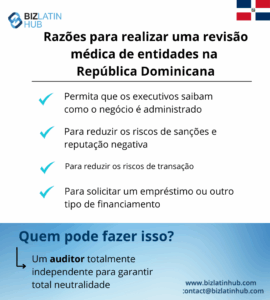 Se você está procurando a formação de empresa na República Dominicanavocê deve fazer um exame de saúde da entidade. Uma verificação da saúde da entidade na República Dominicana envolverá um exame completo da conformidade da empresa com as regulamentações locais. Você também pode optar por uma verificação da saúde da entidade na República Dominicana se já tiver uma empresa no país e quiser simplesmente auditar suas operações atuais para identificar possíveis opções para melhorar seus resultados. Este guia explica a importância de uma auditoria de conformidade proativa e detalha as principais áreas de análise necessárias para garantir que uma empresa opere de acordo com a legislação dominicana.