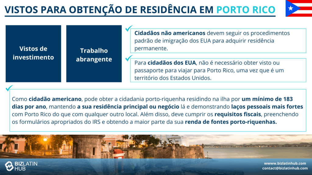Investir em Porto Rico pode fazer parte de uma estratégia para que você obtenha um visto de investidor dos EUA, como o visto E-2 ou EB-5. Esses vistos dos EUA permitiriam que você residisse em Porto Rico. Porto Rico em si não tem um programa separado de residência por investimento.