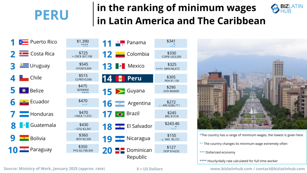 What is the minimum wage in Peru? | The current minimum wage as of January 2025 is S/1,130 (aprox USD$300). |