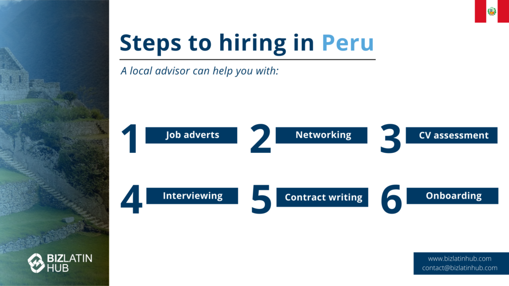 Steps to hiring in Peru | A local advisor can help you with: Job adverts Networking CV assessment Interviewing Contract writing Onboarding |