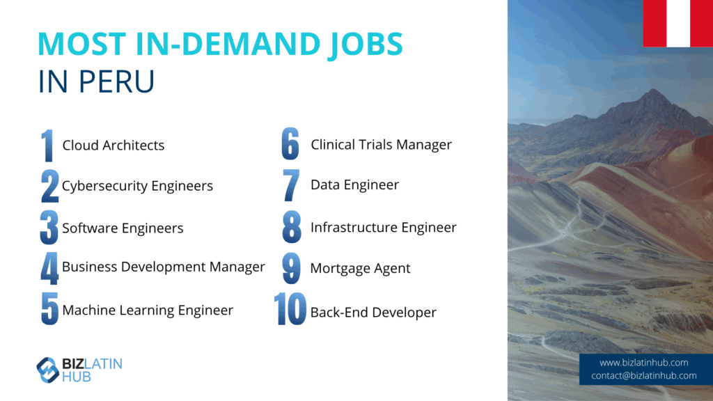 What are the key positions for hiring in Peru? | Key sectors in Peru include tech, especially: Systems engineers Senior product managers Product designers Software programmers Statistical analysts |