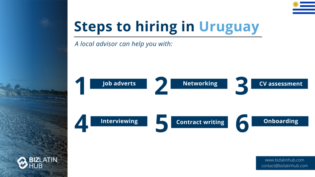 Steps to hiring in Uruguay | A local advisor can help you with: Job adverts Networking CV assessment Interviewing Contract writing Onboarding |