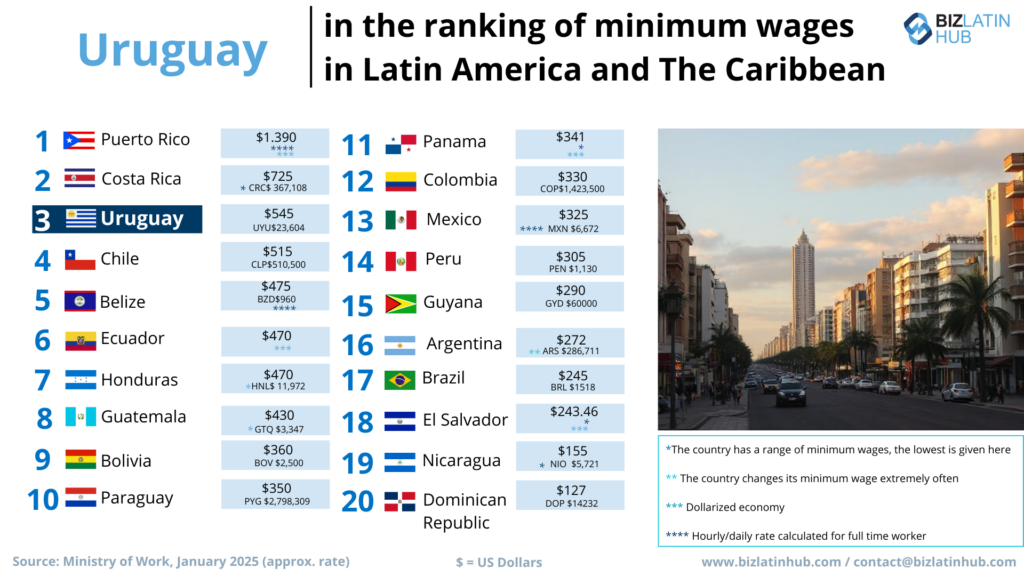 What is the minimum wage in Uruguay? | The current monthly minimum wage as of January 2025 is $U23,604 (aprox USD$545) |