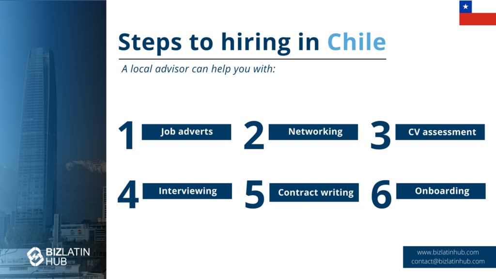 Steps to hiring in Chile | A local advisor can help you with: Job adverts Networking CV assessment Interviewing Contract writing Onboarding |