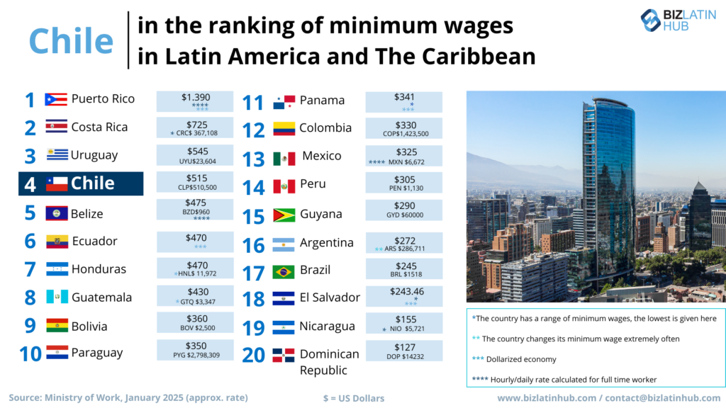 What is the minimum wage in Chile? | The minimum wage in Chile is CLP$510,500 (aprox USD$515) as of January 2025 |