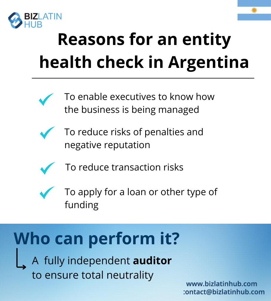 Who conducts an entity health check in Argentina? | It should be done by a fully independent auditor to ensure total neutrality. The auditor should also be well aware of Argentinian company law. |