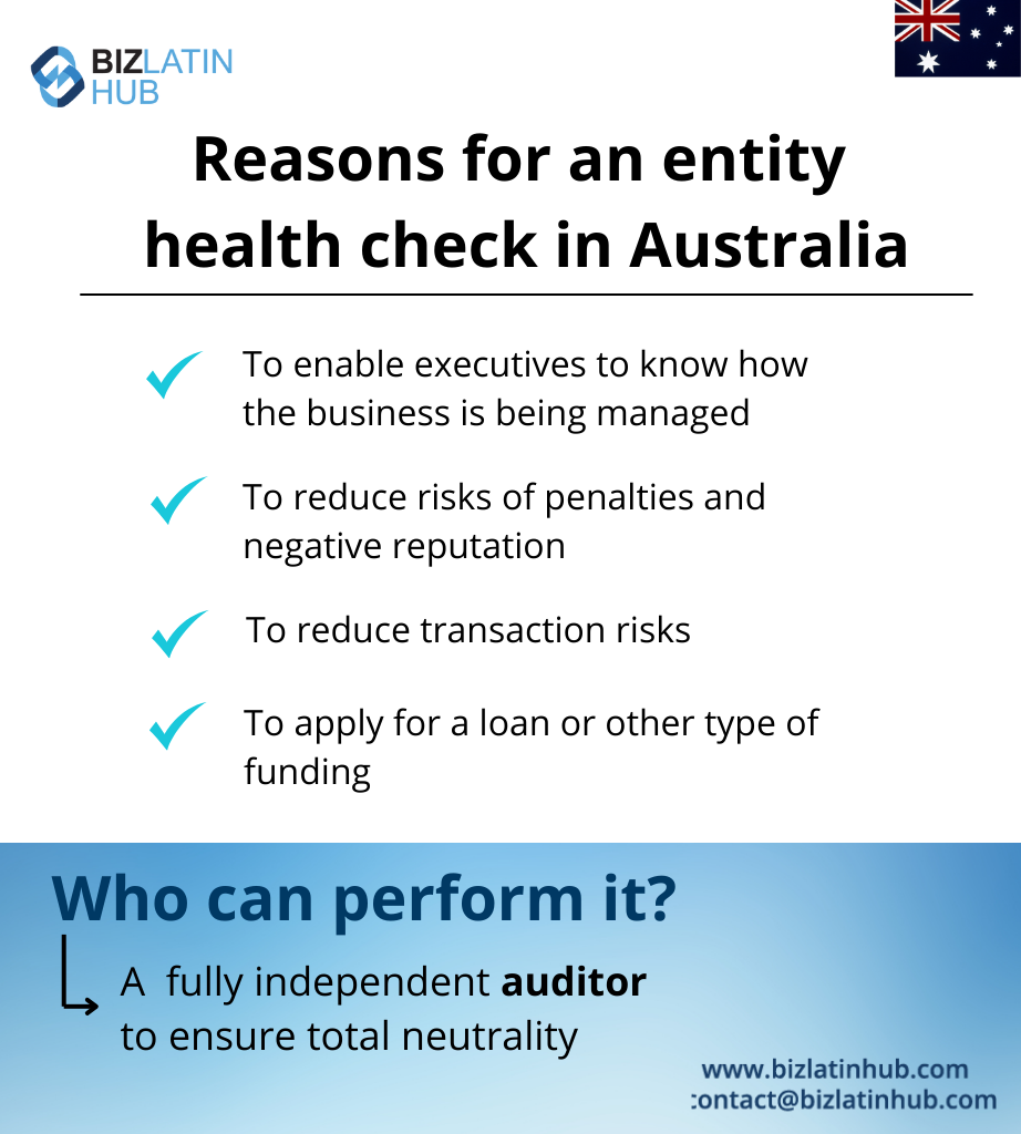 An entity health check in Australia is essential if you are looking to invest in a locally based company. It requires an in-depth audit of a potential acquisition or investment, aimed to mitigate possible risks and unexpected expenses that may arise in the future.