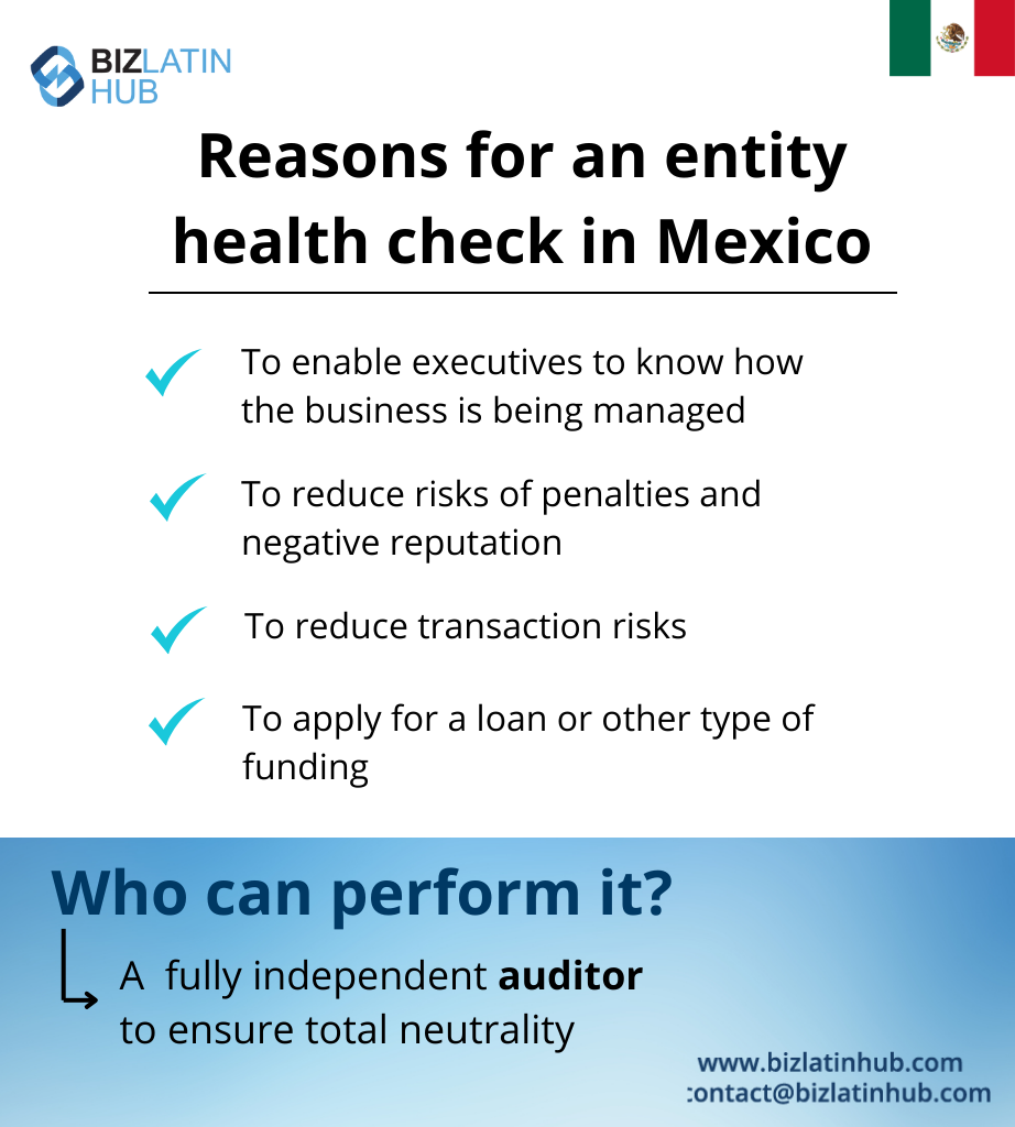 Companies operating in Mexico need regular entity health checks to ensure compliance with Mexican regulations. An entity health check in Mexico serves as comprehensive due diligence Mexico companies require to avoid penalties and maintain good standing with authorities. Annual reviews protect your subsidiary or branch from unforeseen risks after company formation in Mexico. This guide explains why a proactive compliance audit is a critical business practice and details the primary areas of review for any company operating in Mexico.