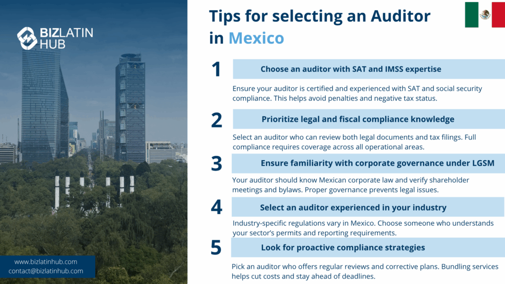 Entity health checks require: independent certified auditors (Contador Público Certificado), knowledge of Mexican corporate law (LGSM), SAT authorized tax advisors, and experience with Mexican authorities. Choose auditors registered with Mexican Institute of Public Accountants (IMCP) for credibility with tax authorities.